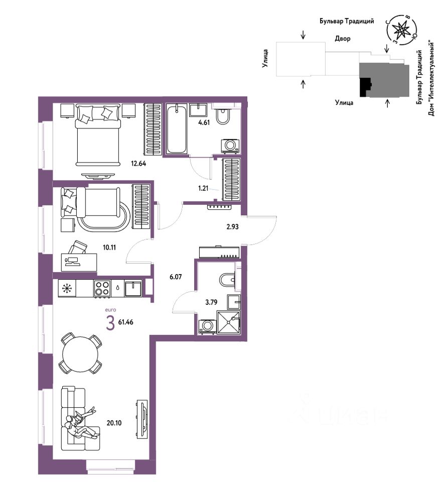 Продается 3комнатная квартира на 6 этаже от застройщика Страна Девелопмент. Площадь квартиры 61,46 кв. м.
