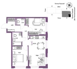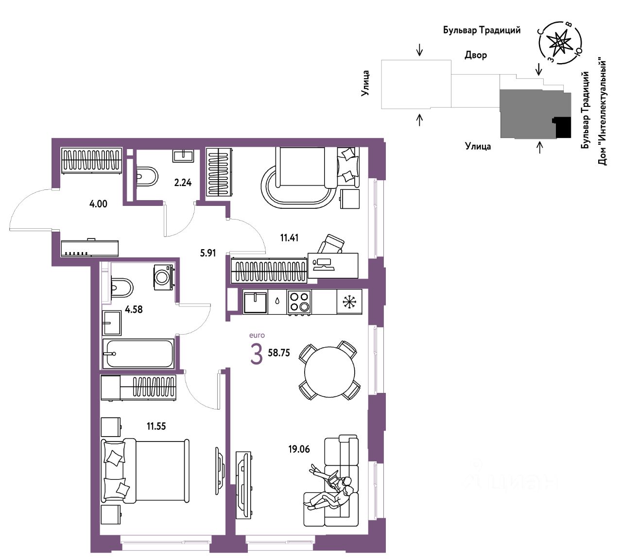 Продается 3комнатная квартира на 7 этаже от застройщика Страна Девелопмент. Площадь квартиры 58,75 кв. м.