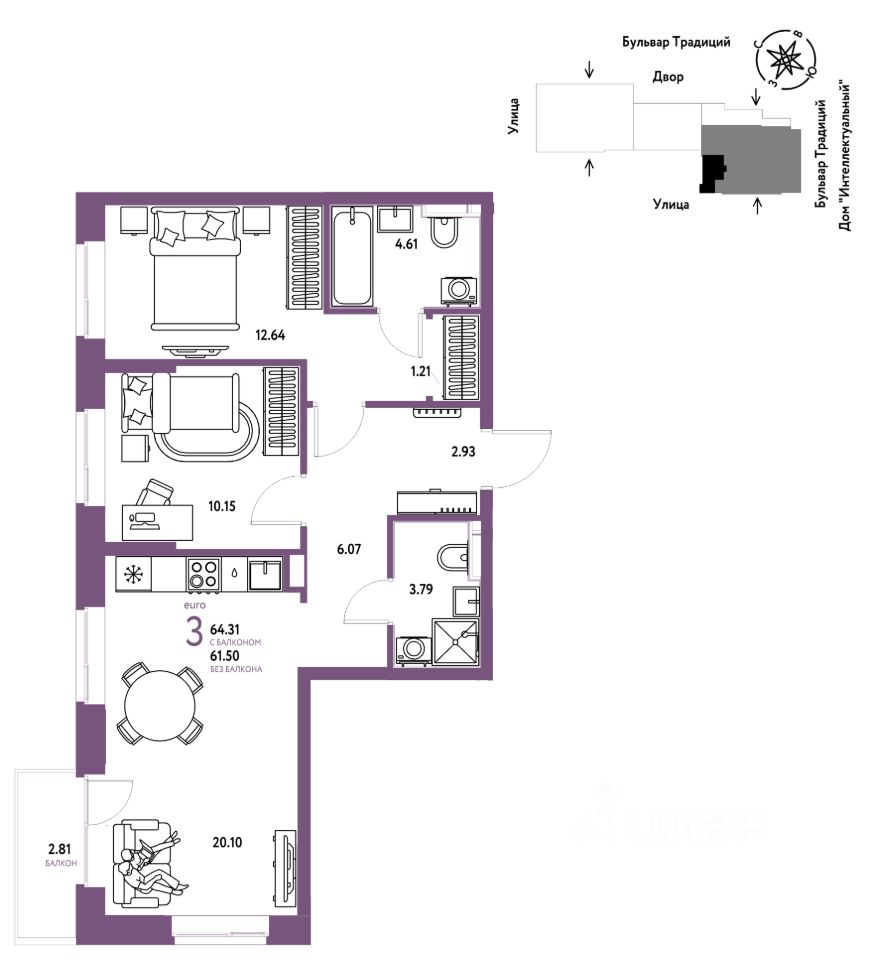 Продается 3комнатная квартира на 7 этаже от застройщика Страна Девелопмент. Площадь квартиры 64,31 кв. м.