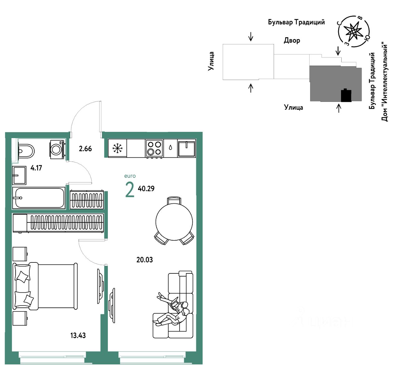 Продается 2комнатная квартира на 8 этаже от застройщика Страна Девелопмент. Площадь квартиры 40,29 кв. м.
