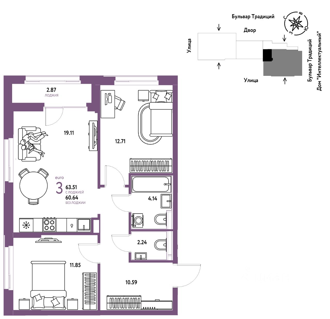 Продается 3комнатная квартира на 10 этаже от застройщика Страна Девелопмент. Площадь квартиры 63,51 кв. м.