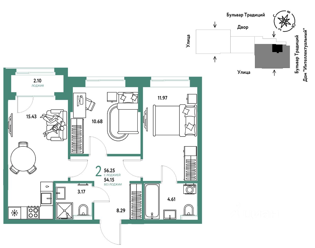 Продается 2комнатная квартира на 10 этаже от застройщика Страна Девелопмент. Площадь квартиры 56,25 кв. м.