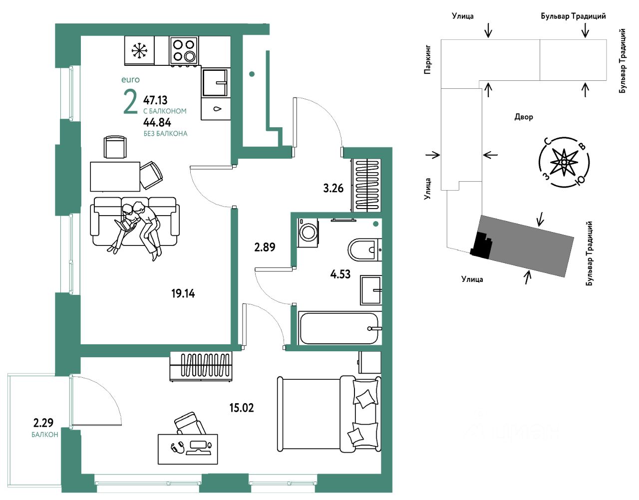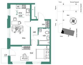 Продается 2комнатная квартира на 6 этаже от застройщика Страна Девелопмент. Площадь квартиры 47,13 кв. м.
