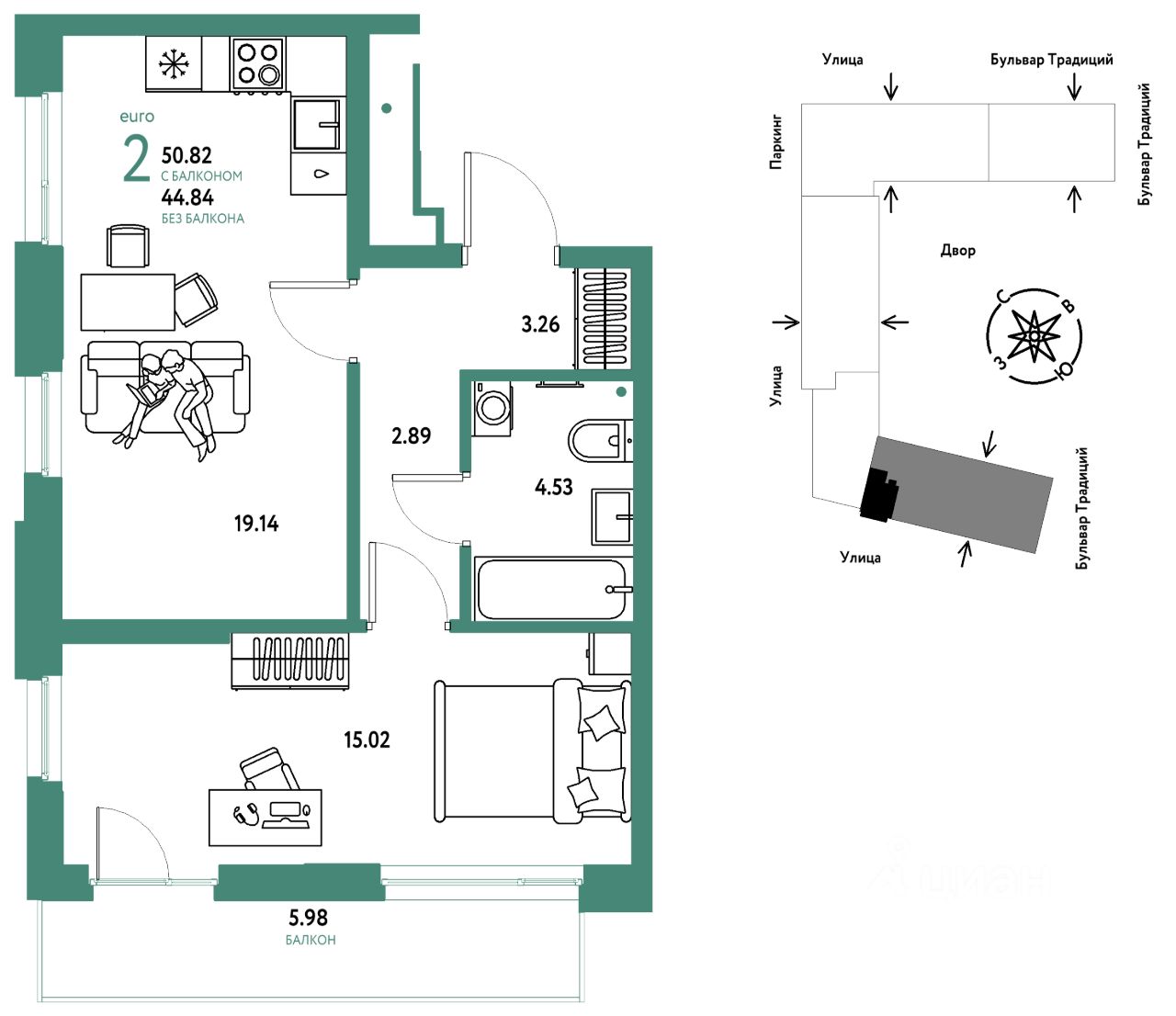 Продается 2комнатная квартира на 9 этаже от застройщика Страна Девелопмент. Площадь квартиры 50,82 кв. м.