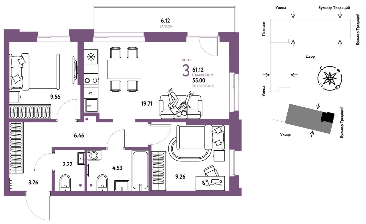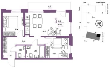 Продается 3комнатная квартира на 13 этаже от застройщика Страна Девелопмент. Площадь квартиры 61,12 кв. м.