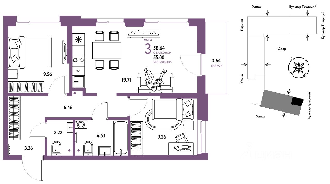 Продается 3комнатная квартира на 14 этаже от застройщика Страна Девелопмент. Площадь квартиры 58,64 кв. м.