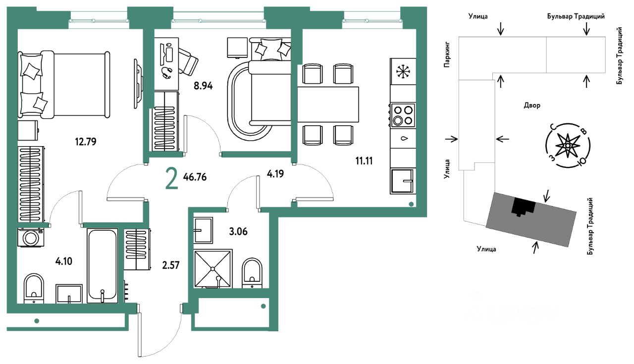 Продается 2комнатная квартира на 15 этаже от застройщика Страна Девелопмент. Площадь квартиры 46,76 кв. м.