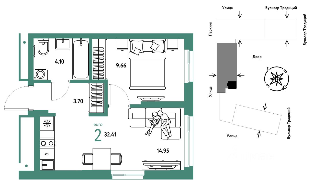 Продается 2комнатная квартира на 3 этаже от застройщика Страна Девелопмент. Площадь квартиры 32,41 кв. м.