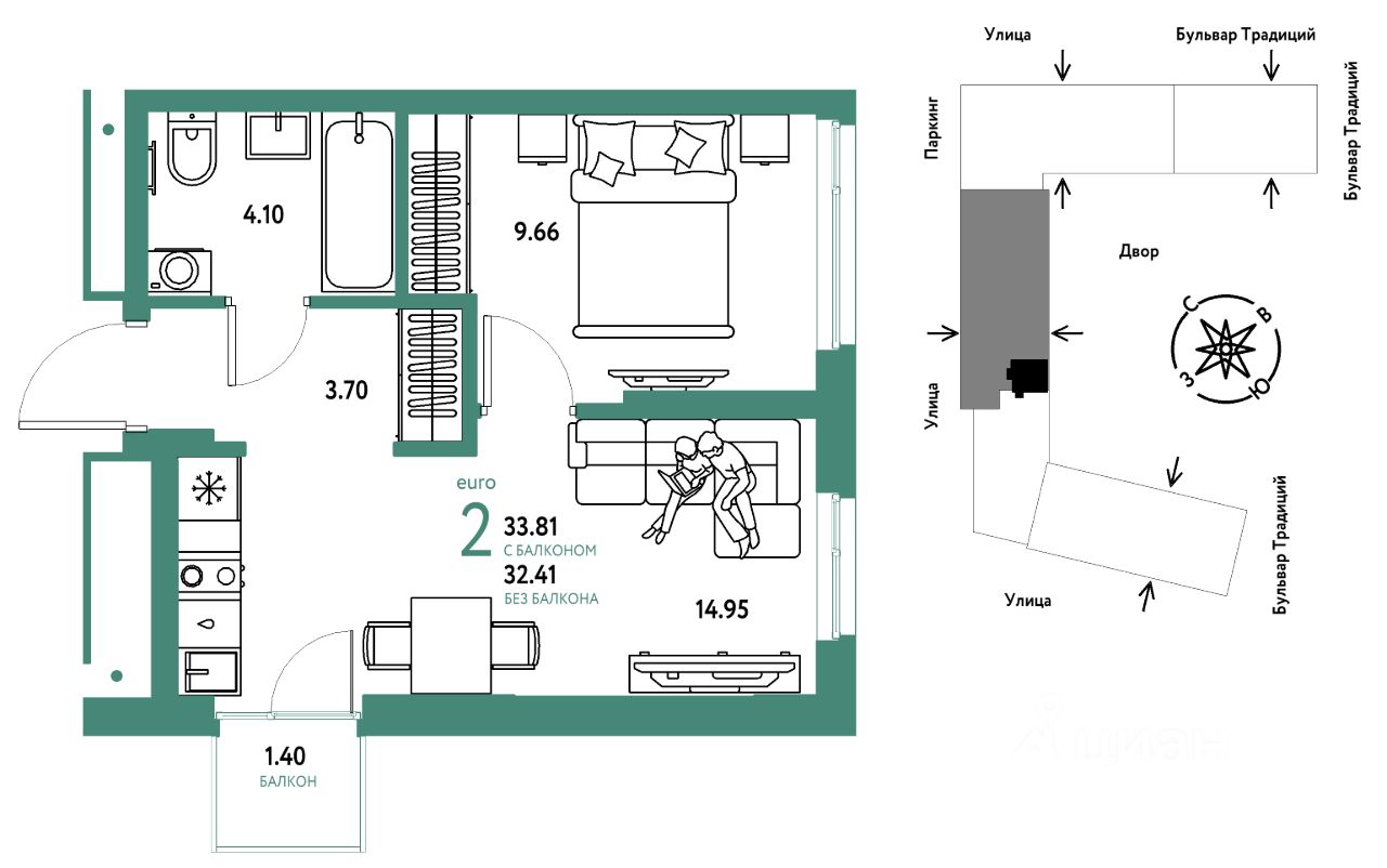 Продается 2комнатная квартира на 4 этаже от застройщика Страна Девелопмент. Площадь квартиры 33,81 кв. м.