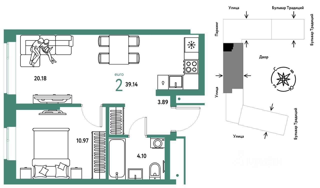 Продается 2комнатная квартира на 11 этаже от застройщика Страна Девелопмент. Площадь квартиры 39,14 кв. м.
