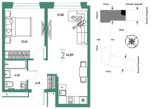 Продается 2комнатная квартира на 7 этаже от застройщика Страна Девелопмент. Площадь квартиры 42,89 кв. м.