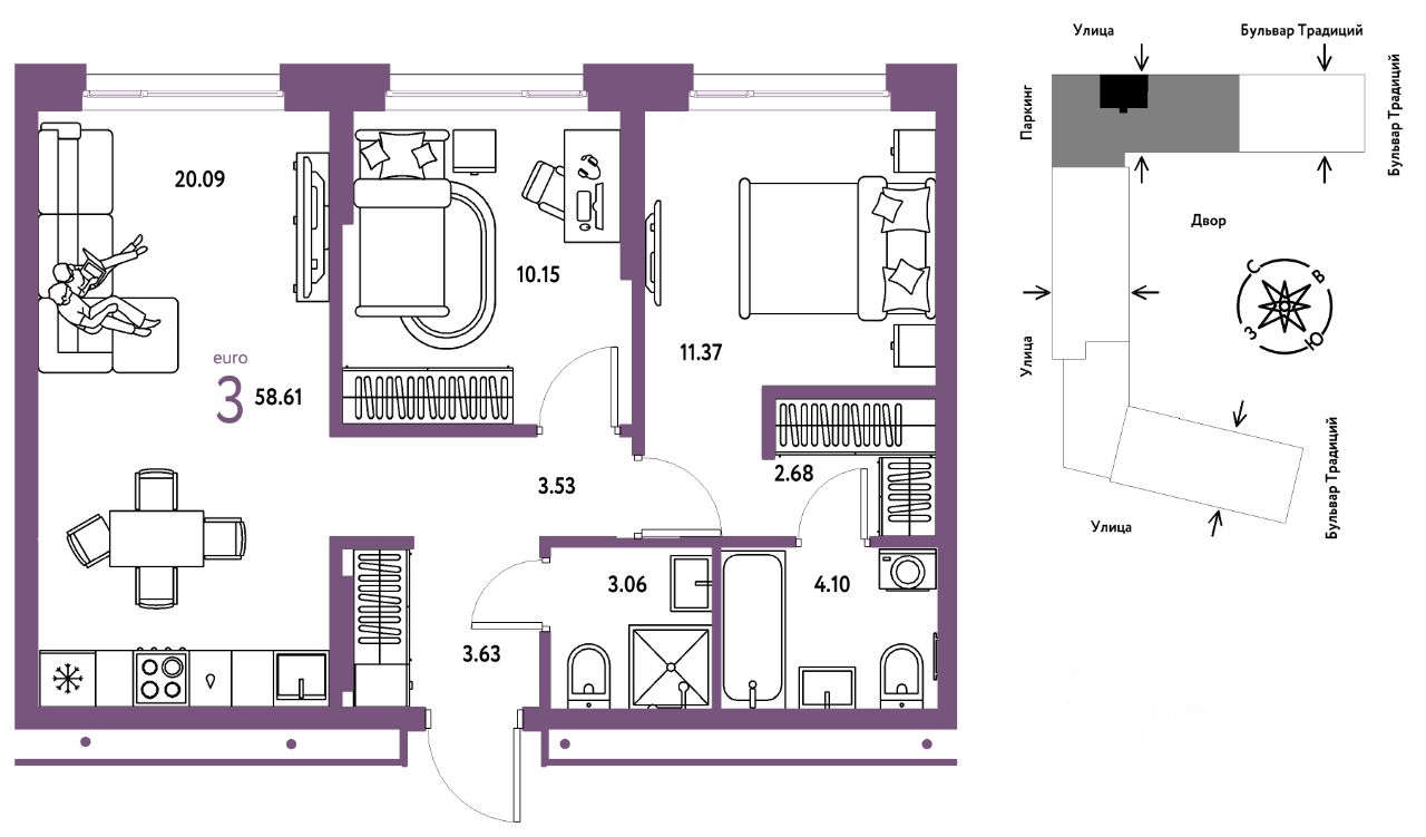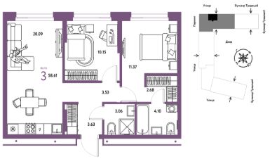 Продается 3комнатная квартира на 8 этаже от застройщика Страна Девелопмент. Площадь квартиры 58,61 кв. м.