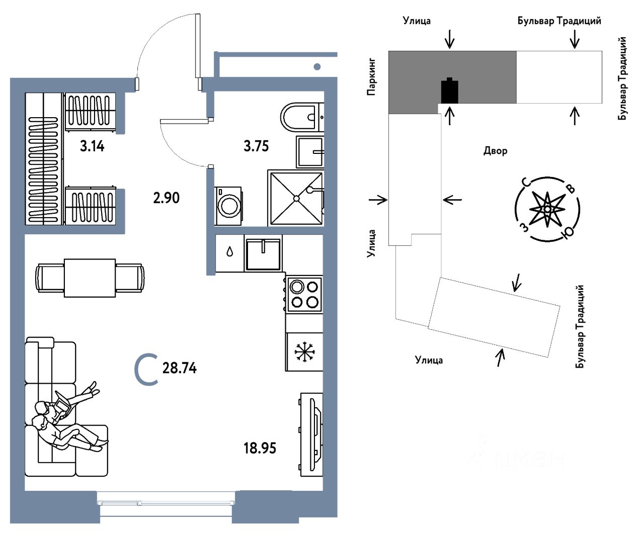 Продается 1комнатная квартира на 8 этаже от застройщика Страна Девелопмент. Площадь квартиры 28,74 кв. м.
