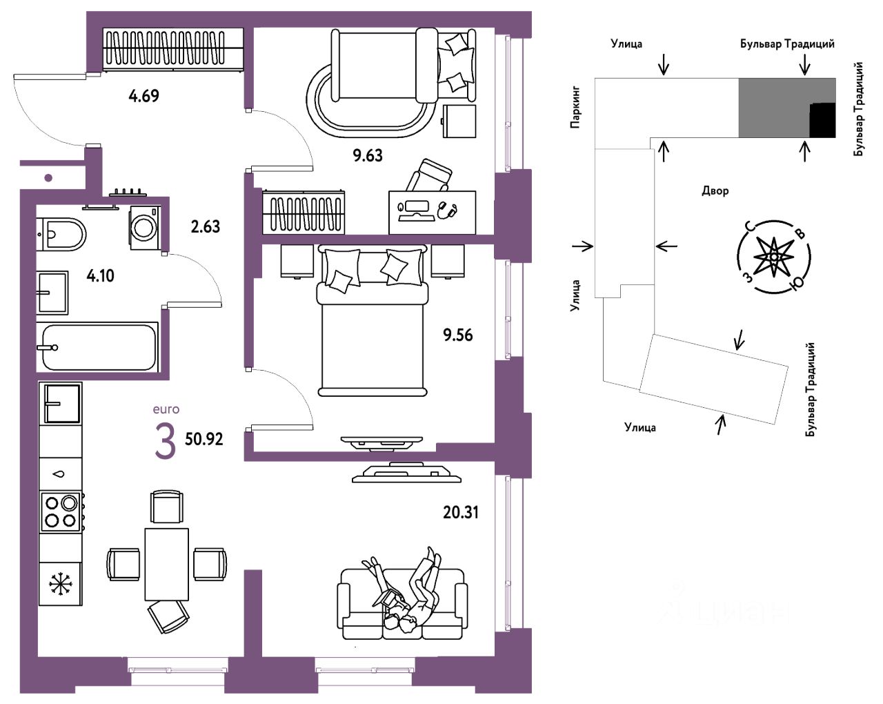 Продается 3комнатная квартира на 6 этаже от застройщика Страна Девелопмент. Площадь квартиры 50,92 кв. м.