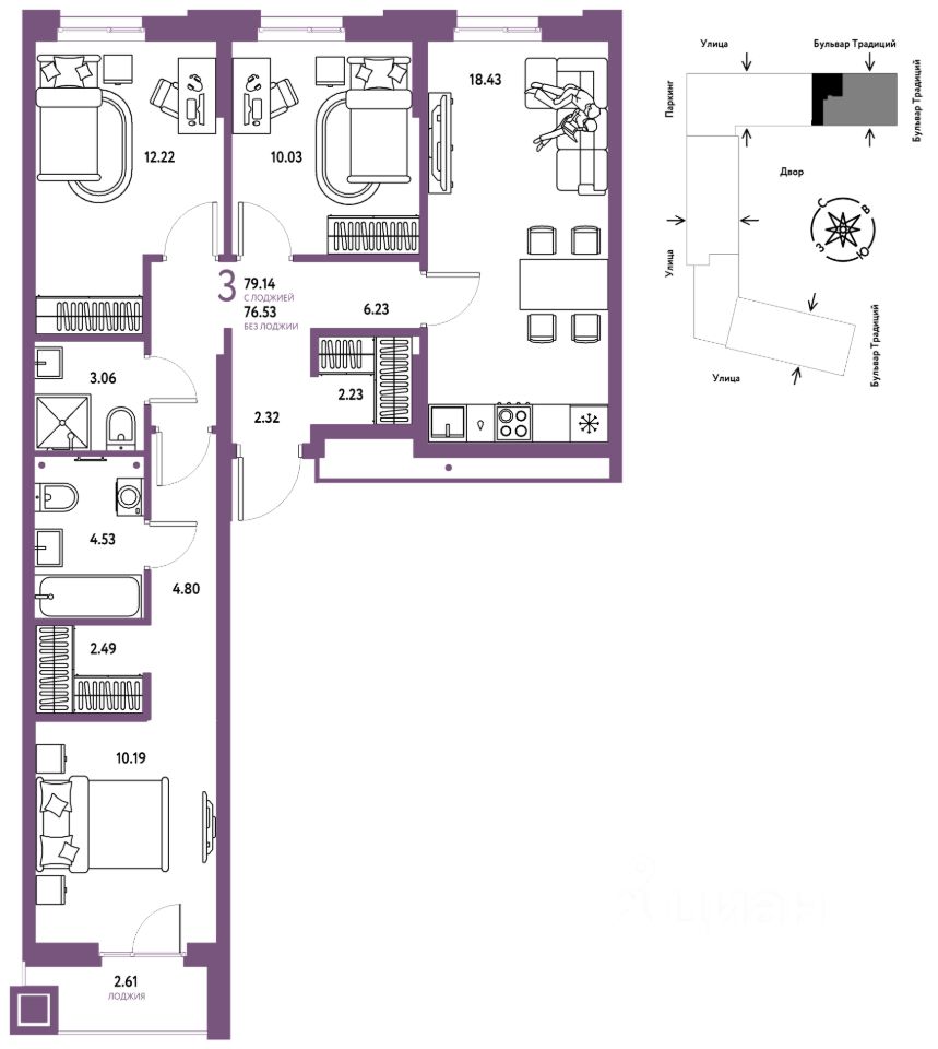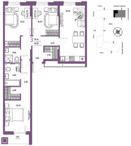 Продается 3комнатная квартира на 8 этаже от застройщика Страна Девелопмент. Площадь квартиры 79,14 кв. м.