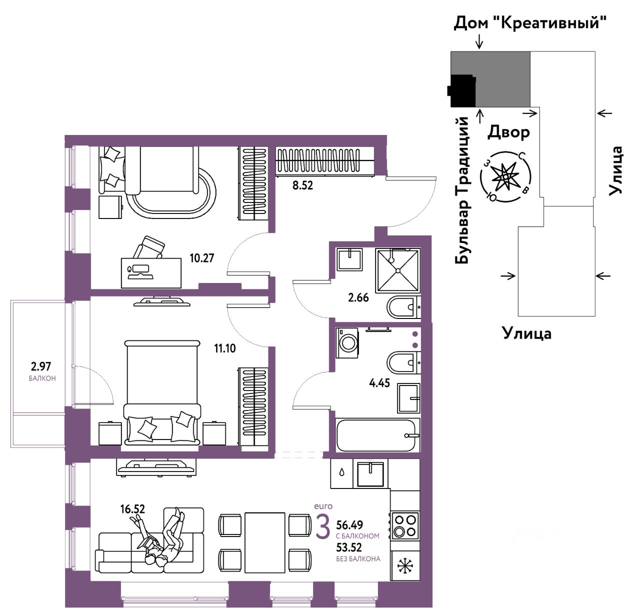 Продается 3комнатная квартира на 3 этаже от застройщика Страна Девелопмент. Площадь квартиры 56,49 кв. м.