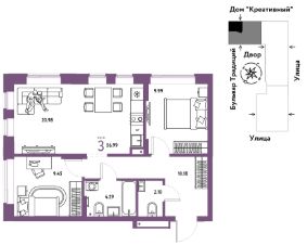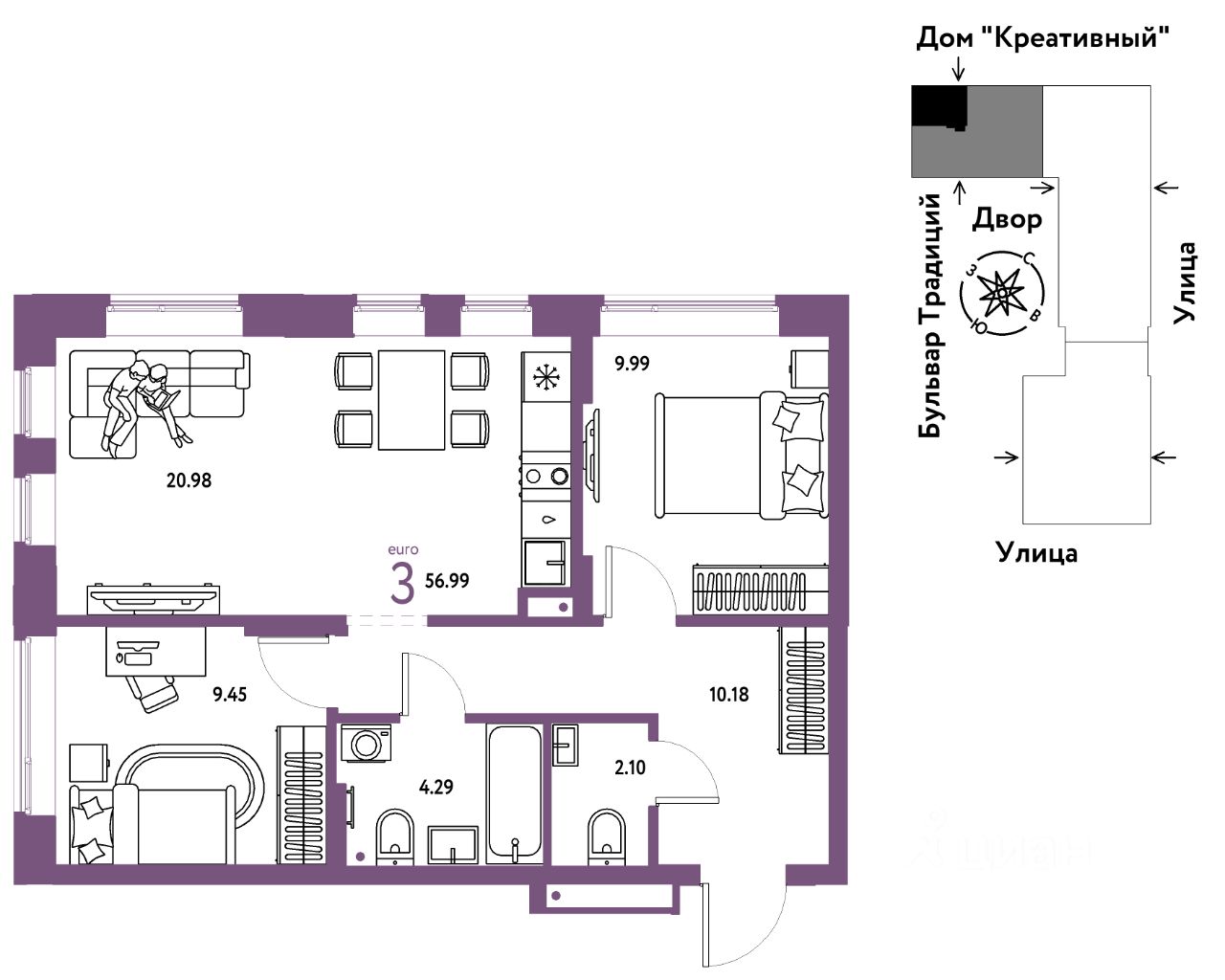 Продается 3комнатная квартира на 5 этаже от застройщика Страна Девелопмент. Площадь квартиры 56,99 кв. м.