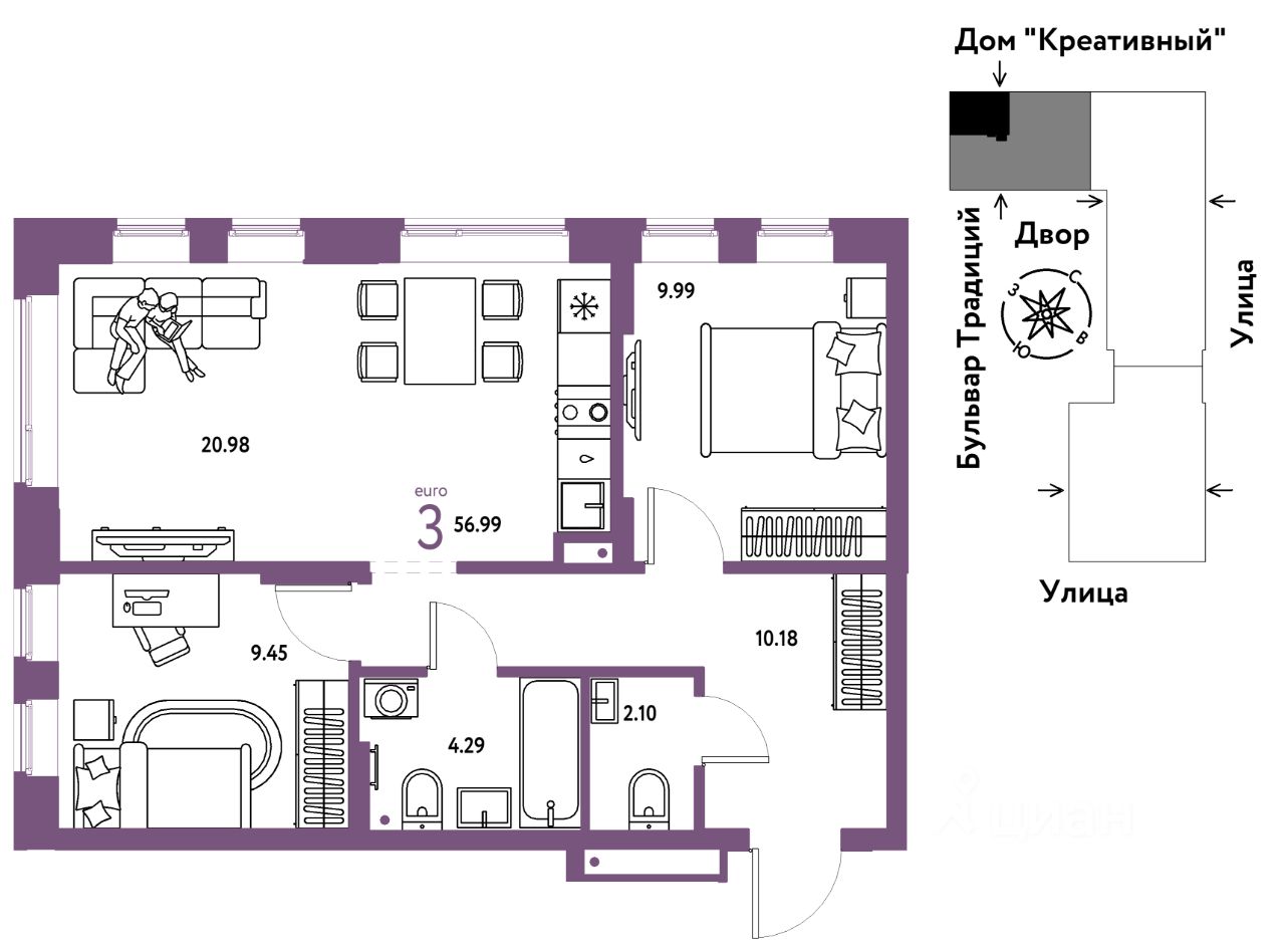 Продается 3комнатная квартира на 8 этаже от застройщика Страна Девелопмент. Площадь квартиры 56,99 кв. м.