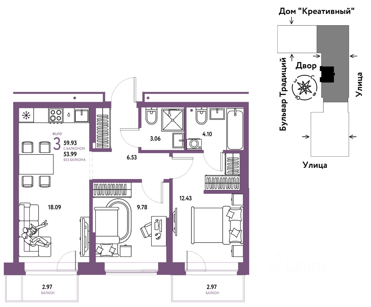Продается 3комнатная квартира на 3 этаже от застройщика Страна Девелопмент. Площадь квартиры 59,93 кв. м.