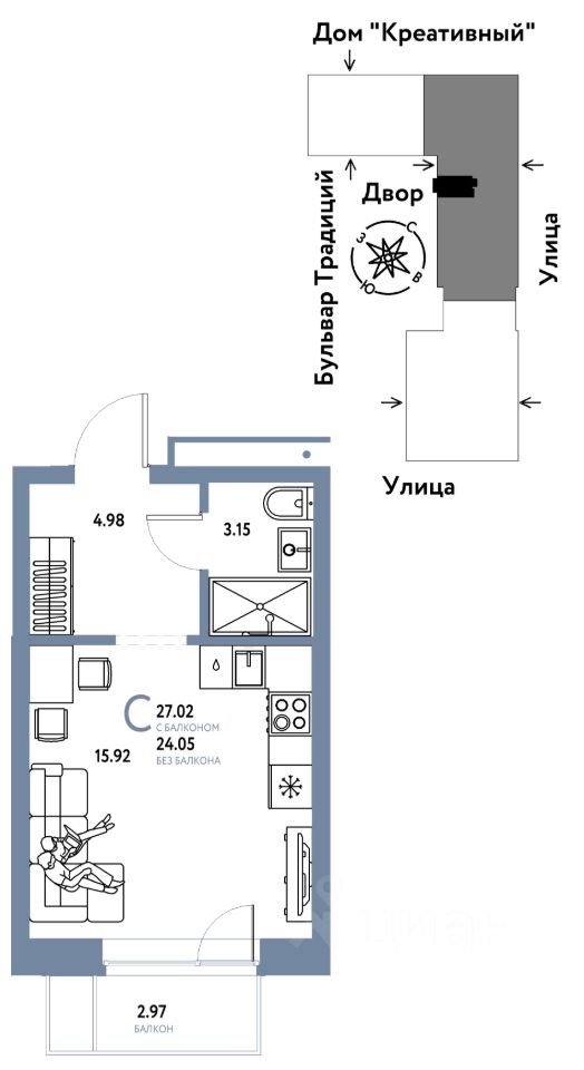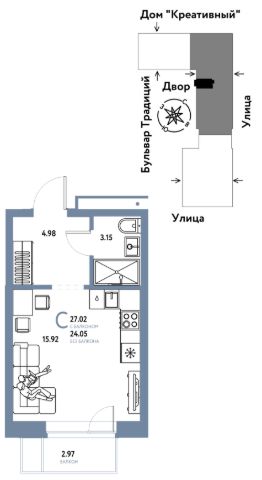 Продается 1комнатная квартира на 4 этаже от застройщика Страна Девелопмент. Площадь квартиры 27,02 кв. м.