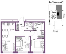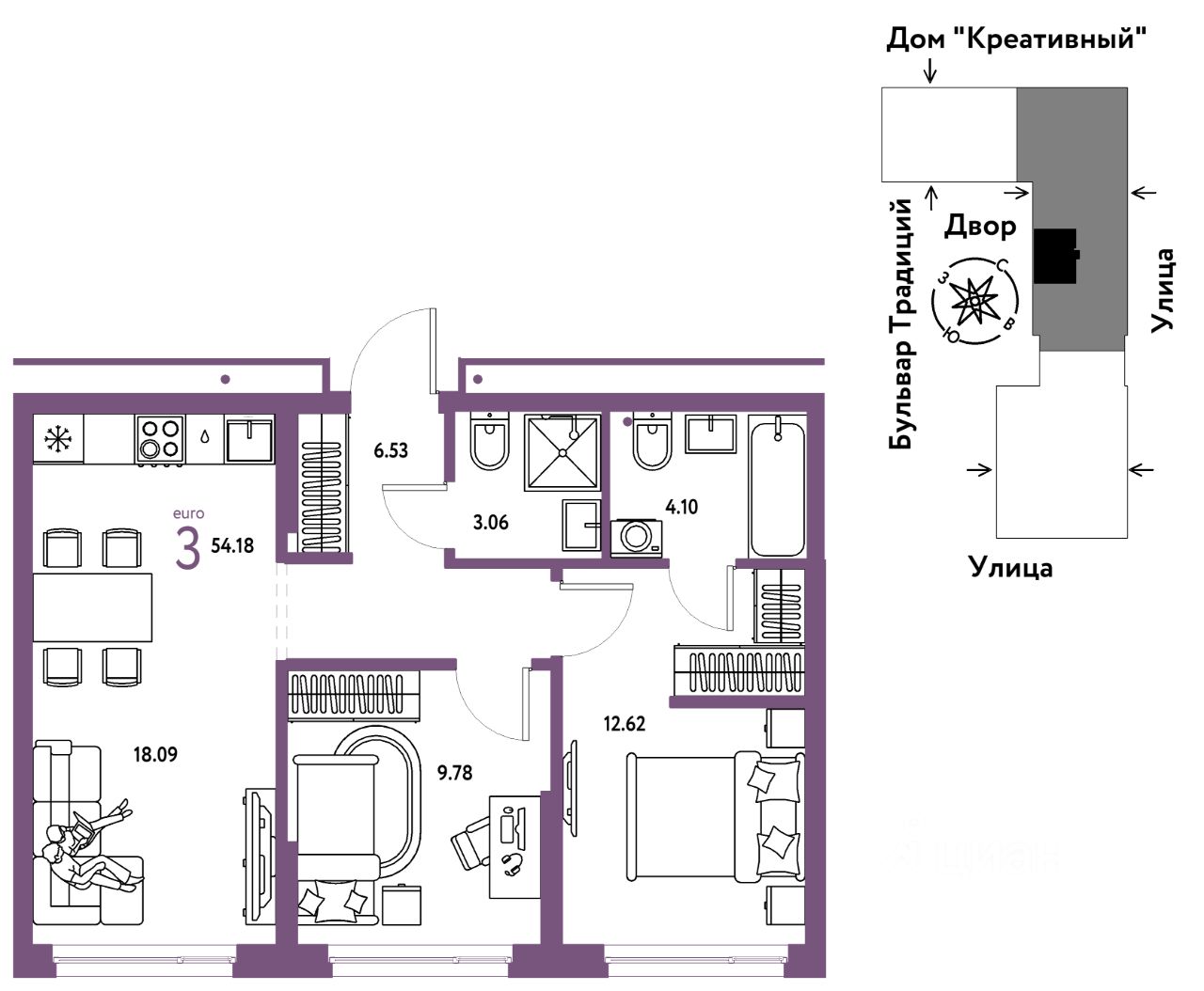 Продается 3комнатная квартира на 12 этаже от застройщика Страна Девелопмент. Площадь квартиры 54,18 кв. м.