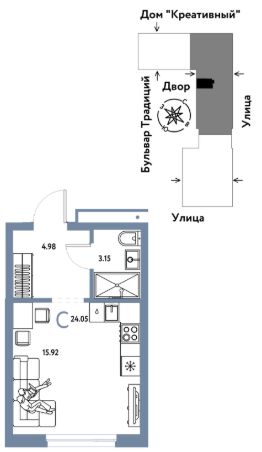 Продается 1комнатная квартира на 12 этаже от застройщика Страна Девелопмент. Площадь квартиры 24,05 кв. м.