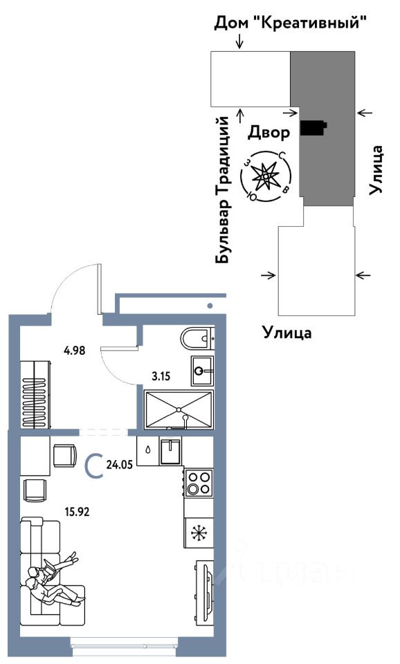 Продается 1комнатная квартира на 13 этаже от застройщика Страна Девелопмент. Площадь квартиры 24,05 кв. м.