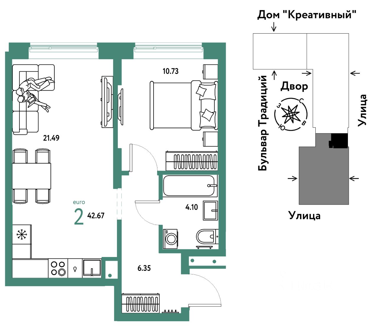 Продается 2комнатная квартира на 8 этаже от застройщика Страна Девелопмент. Площадь квартиры 42,67 кв. м.