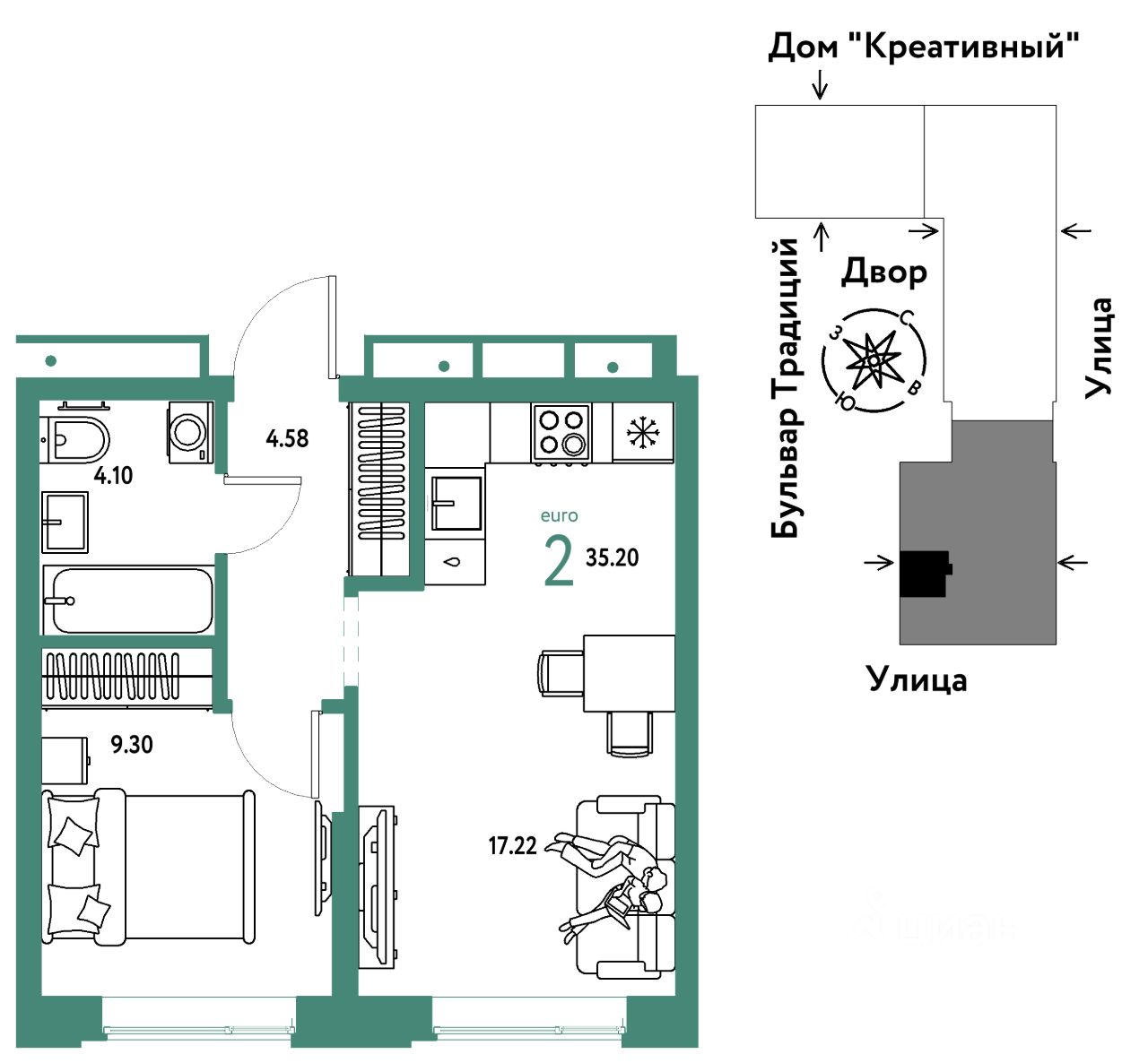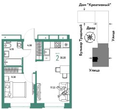 Продается 2комнатная квартира на 8 этаже от застройщика Страна Девелопмент. Площадь квартиры 35,2 кв. м.