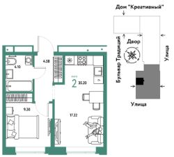 Продается 2комнатная квартира на 15 этаже от застройщика Страна Девелопмент. Площадь квартиры 35,2 кв. м.