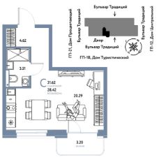 Продается 1комнатная квартира на 3 этаже от застройщика Страна Девелопмент. Площадь квартиры 31,62 кв. м.