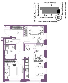 Продается 3комнатная квартира на 6 этаже от застройщика Страна Девелопмент. Площадь квартиры 52,19 кв. м.