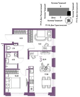 Продается 3комнатная квартира на 8 этаже от застройщика Страна Девелопмент. Площадь квартиры 52,19 кв. м.