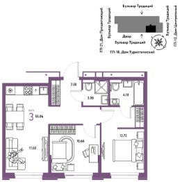 Продается 3комнатная квартира на 10 этаже от застройщика Страна Девелопмент. Площадь квартиры 55,06 кв. м.
