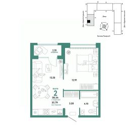 Продается 2комнатная квартира на 8 этаже от застройщика Страна Девелопмент. Площадь квартиры 38,34 кв. м.