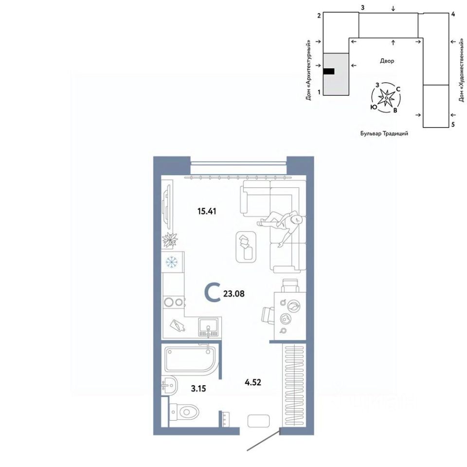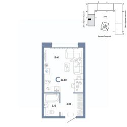 Продается 1комнатная квартира на 9 этаже от застройщика Страна Девелопмент. Площадь квартиры 23,08 кв. м.