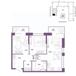 Продается 3комнатная квартира на 10 этаже от застройщика Страна Девелопмент. Площадь квартиры 57,44 кв. м.