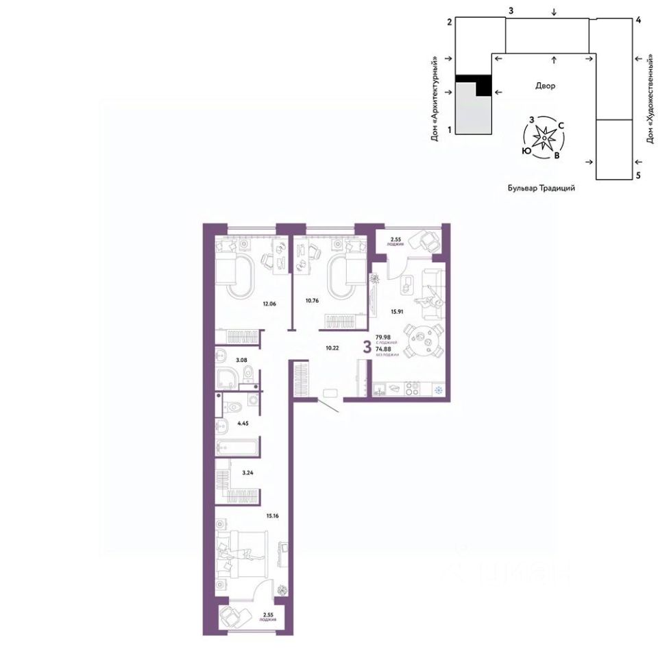 Продается 3комнатная квартира на 11 этаже от застройщика Страна Девелопмент. Площадь квартиры 79,98 кв. м.