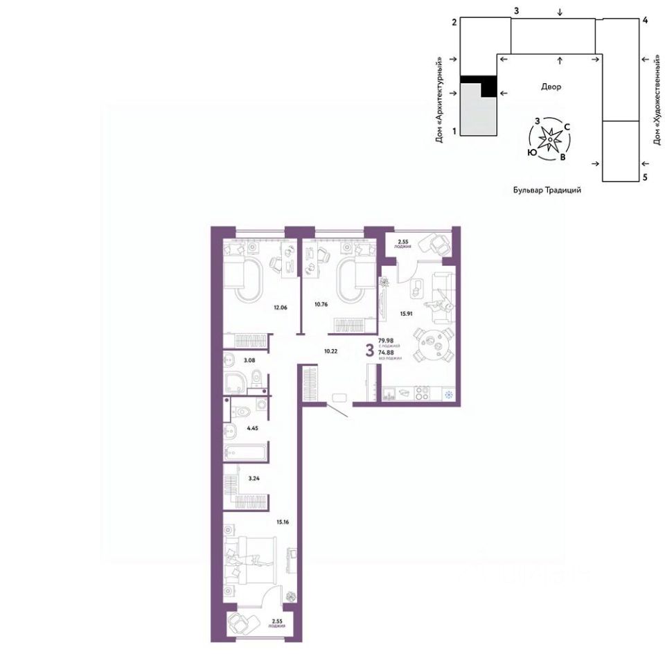 Продается 3комнатная квартира на 12 этаже от застройщика Страна Девелопмент. Площадь квартиры 79,98 кв. м.