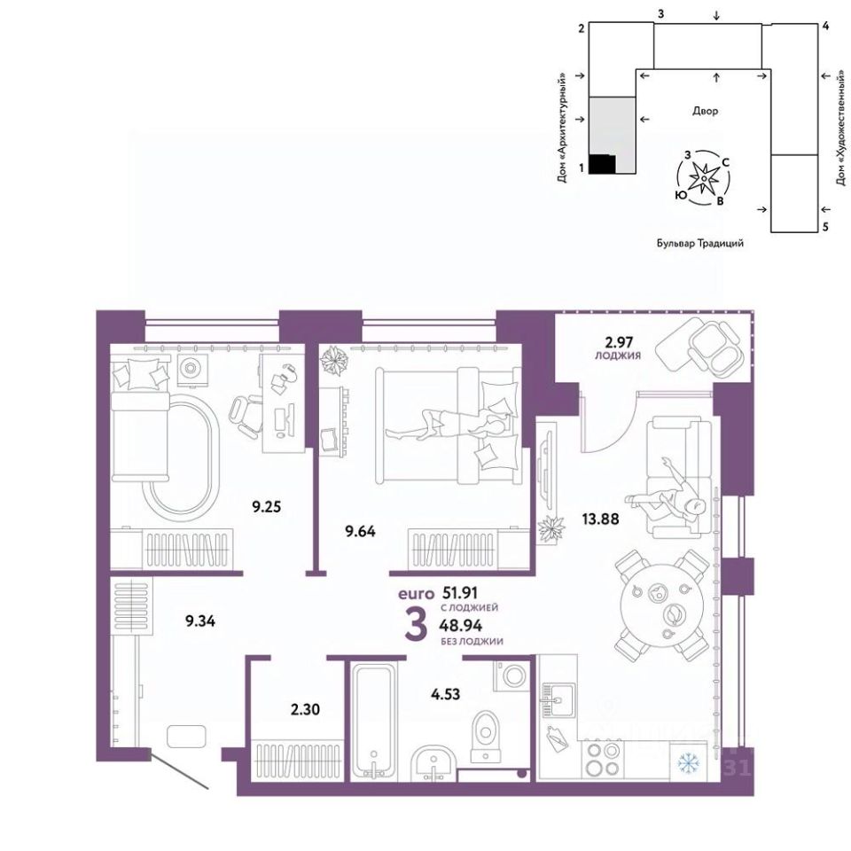 Продается 3комнатная квартира на 15 этаже от застройщика Страна Девелопмент. Площадь квартиры 51,91 кв. м.