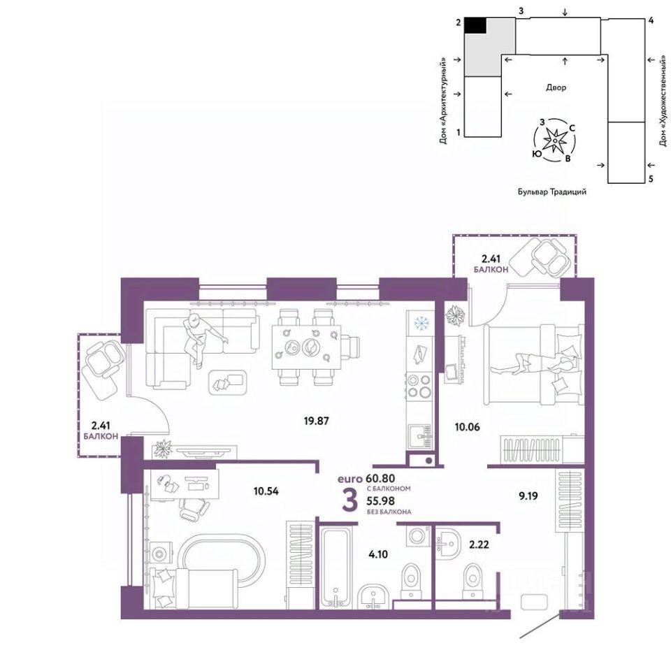 Продается 3комнатная квартира на 4 этаже от застройщика Страна Девелопмент. Площадь квартиры 60,8 кв. м.