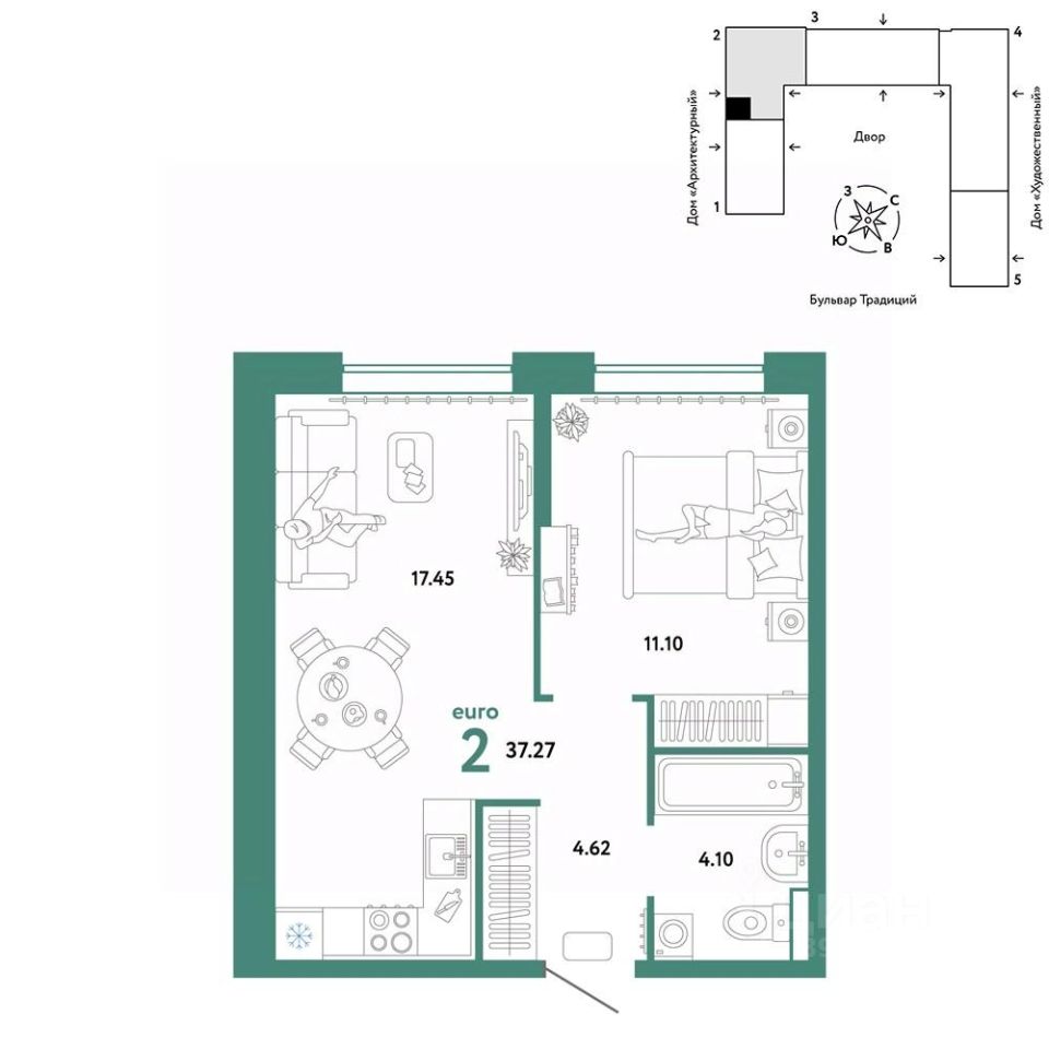 Продается 2комнатная квартира на 9 этаже от застройщика Страна Девелопмент. Площадь квартиры 37,27 кв. м.