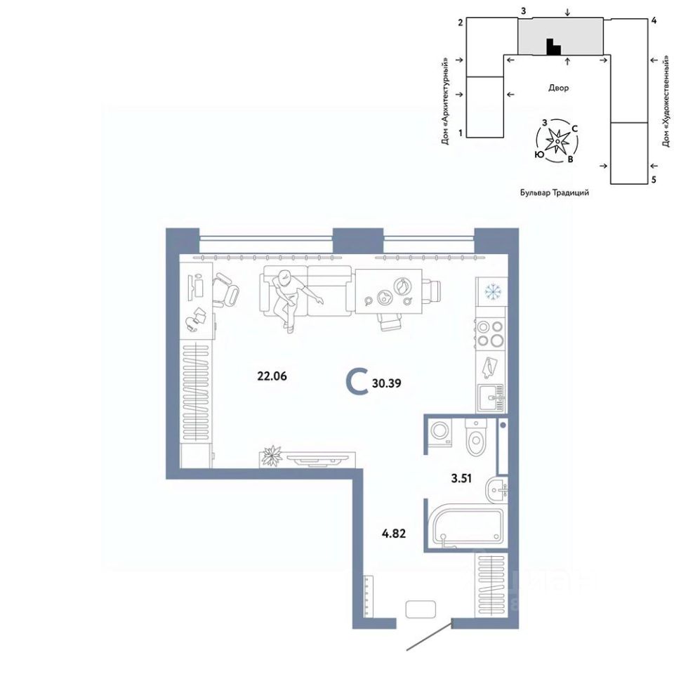 Продается 1комнатная квартира на 4 этаже от застройщика Страна Девелопмент. Площадь квартиры 30,39 кв. м.