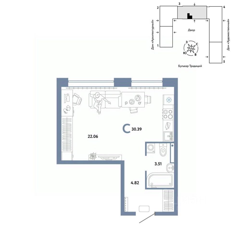 Продается 1комнатная квартира на 6 этаже от застройщика Страна Девелопмент. Площадь квартиры 30,39 кв. м.