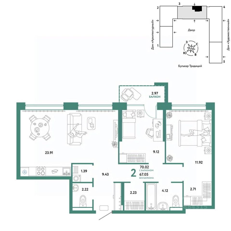 Продается 3комнатная квартира на 6 этаже от застройщика Страна Девелопмент. Площадь квартиры 70,02 кв. м.