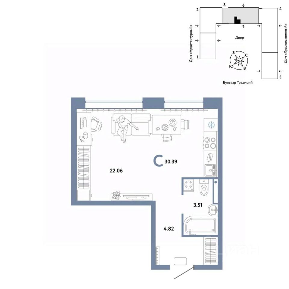 Продается 1комнатная квартира на 8 этаже от застройщика Страна Девелопмент. Площадь квартиры 30,39 кв. м.