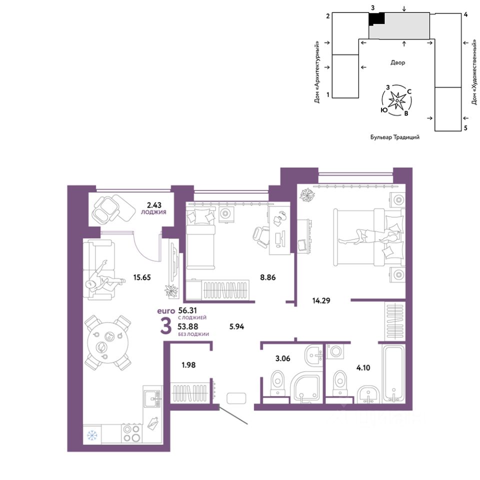 Продается 3комнатная квартира на 9 этаже от застройщика Страна Девелопмент. Площадь квартиры 56,31 кв. м.