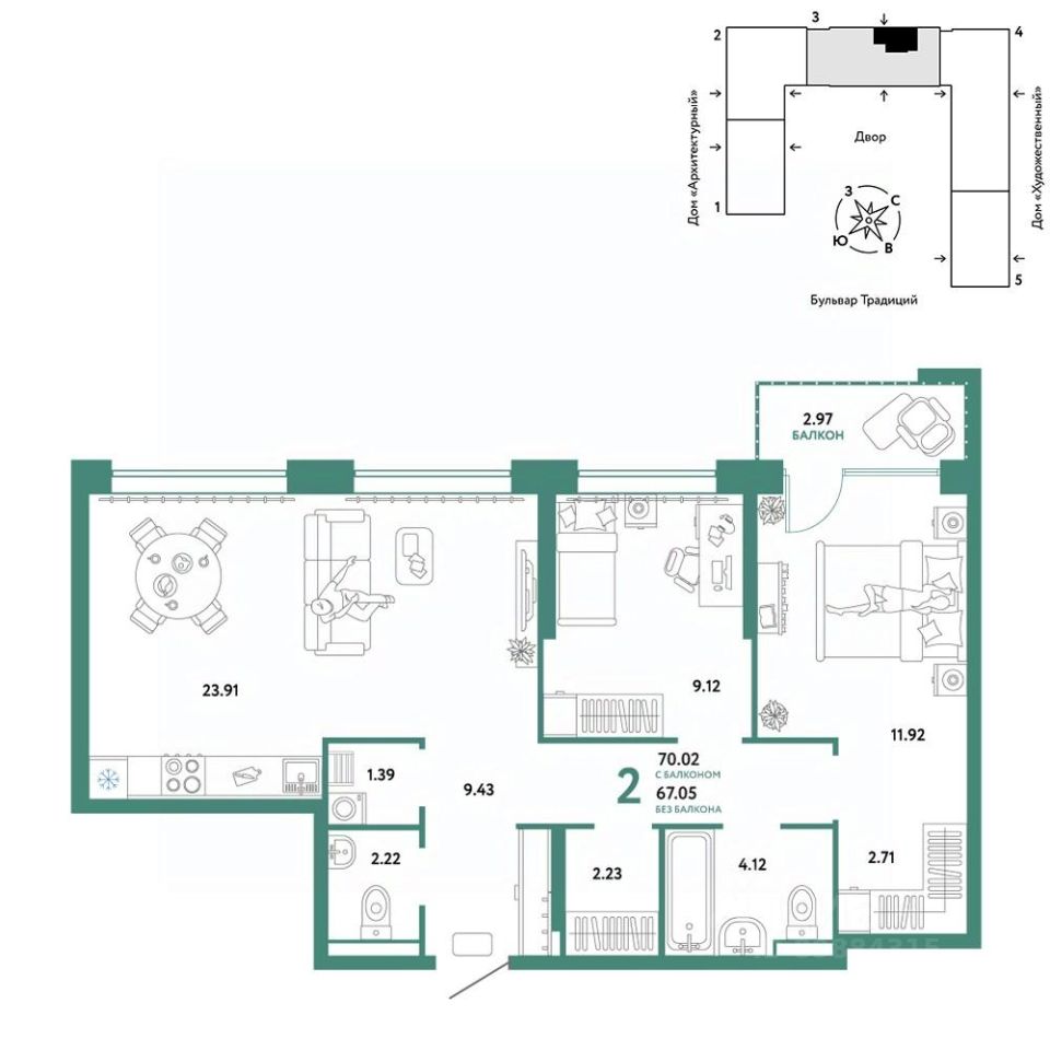 Продается 3комнатная квартира на 9 этаже от застройщика Страна Девелопмент. Площадь квартиры 70,02 кв. м.
