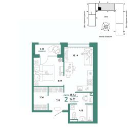 Продается 2комнатная квартира на 13 этаже от застройщика Страна Девелопмент. Площадь квартиры 38,92 кв. м.