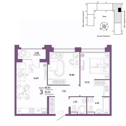 Продается 3комнатная квартира на 2 этаже от застройщика Страна Девелопмент. Площадь квартиры 58,54 кв. м.